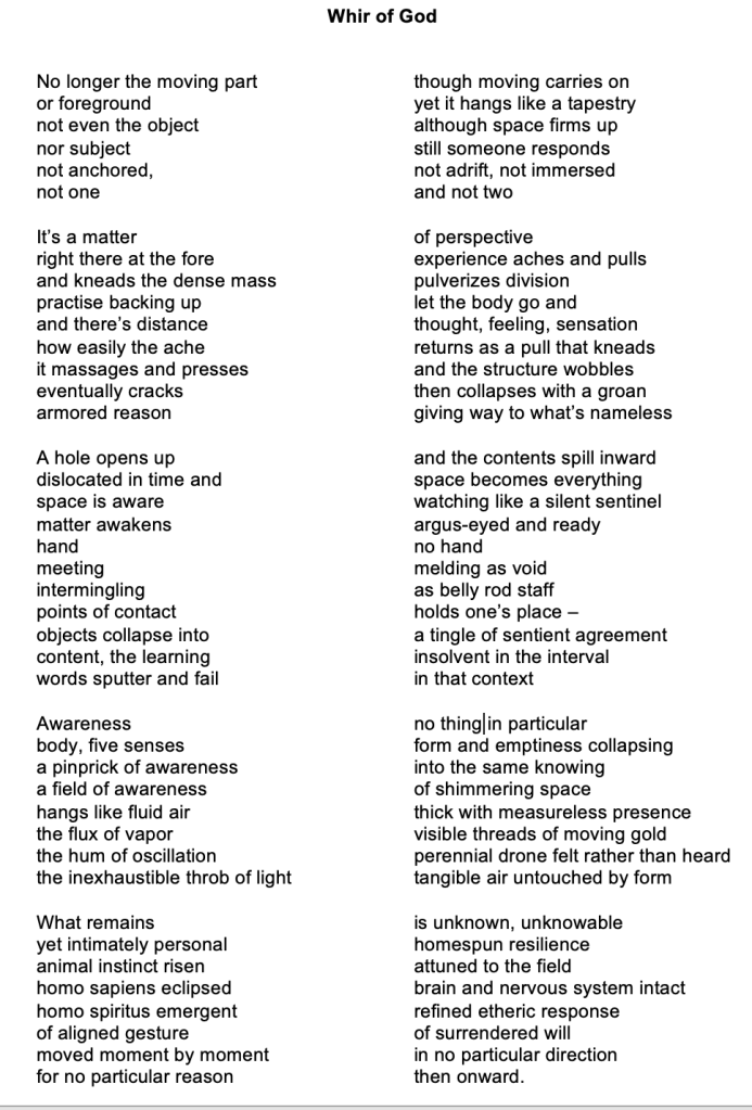 WILLAMETTE AUGUST, SYDNEY LANDING It is getting toward evening and the light is falling down Green tree lined banks make the river look like an eternal corridor Like one of those classic European architectural tricks Where the road, flanked by tall elegant buildings, Gracefully curves away from the eye and into an unknown possibility. The same here with cottonwoods and Oregon ash Taking the place of anything created with The contrivance of human hands. Infinite and limits on display here at Sydney Landing. If the source has limits The trees' attention on each bank blocking out the land behind tan cliffs Wicked submerged logs The tittering of a rock shelf Amusing so obstinate in the river’s powerful cut If this source is limited, then so are we. If the source is infinite This water, flowing from the sky to here Through another grateful graceful corner then another Until it finally finds its way back up into the sky Which is right now cloudless and other-waterly blue If the source is infinite, then assuredly so are you and I.