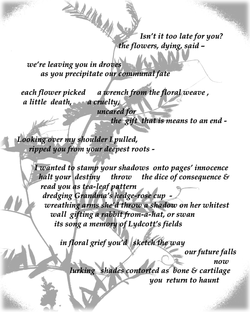 Julie Sampson’s collections are Tessitura (ShearsmanBooks, 2014) and It Was When It Was When It Was (Dempsey & Windle, 2018 ). Her poems are published in a variety of magazines, including recently in Molly Bloom, Projectionist’s Playground, Otoliths, Poetry Village and High Window. Her website is Julie Sampson