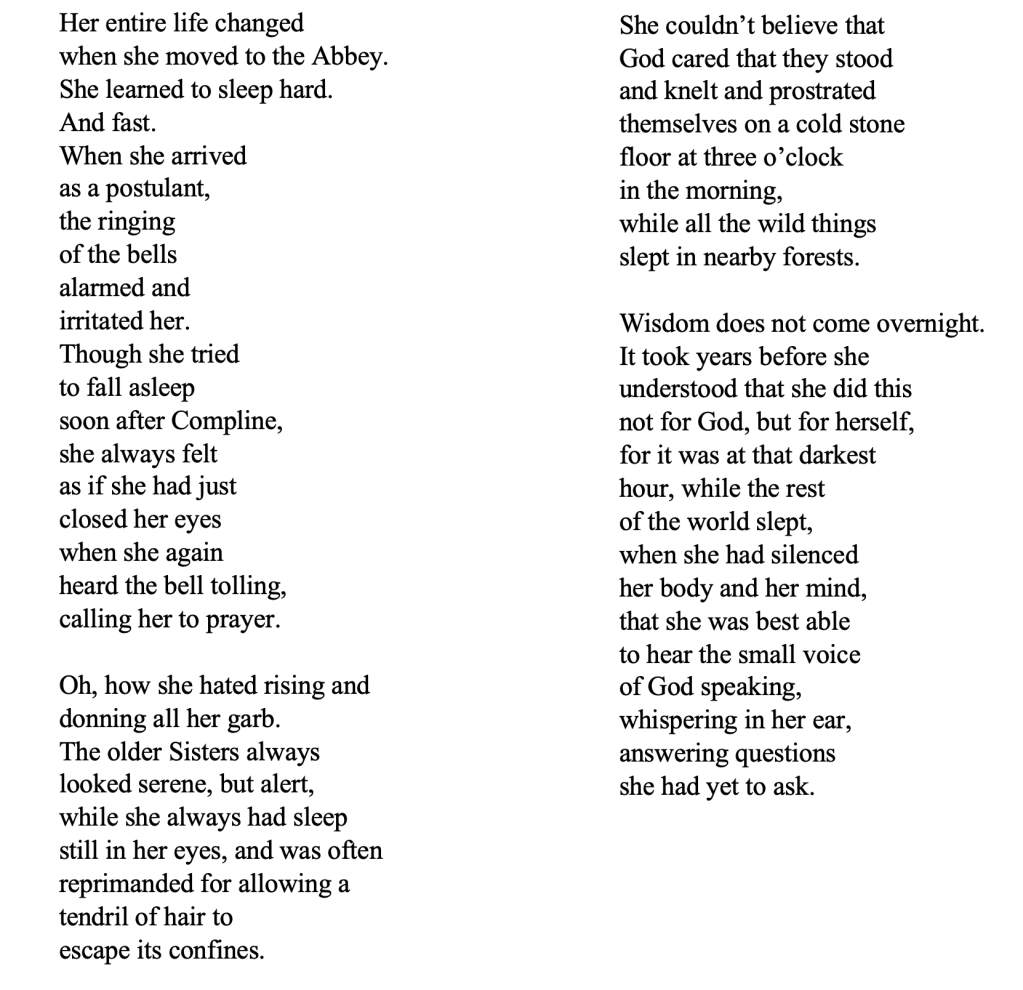 This poem is from an unpublished collection titled The Ecstasy of St. Lola. They consider a young nun named Sister Lola who experiences a profound religious experience.