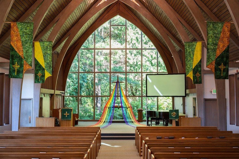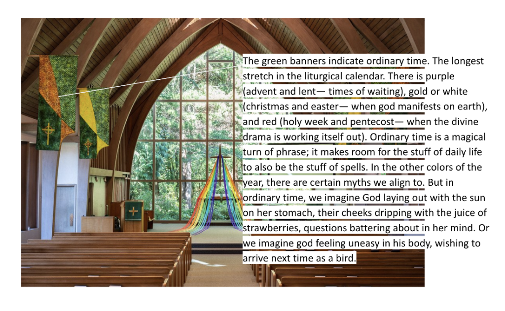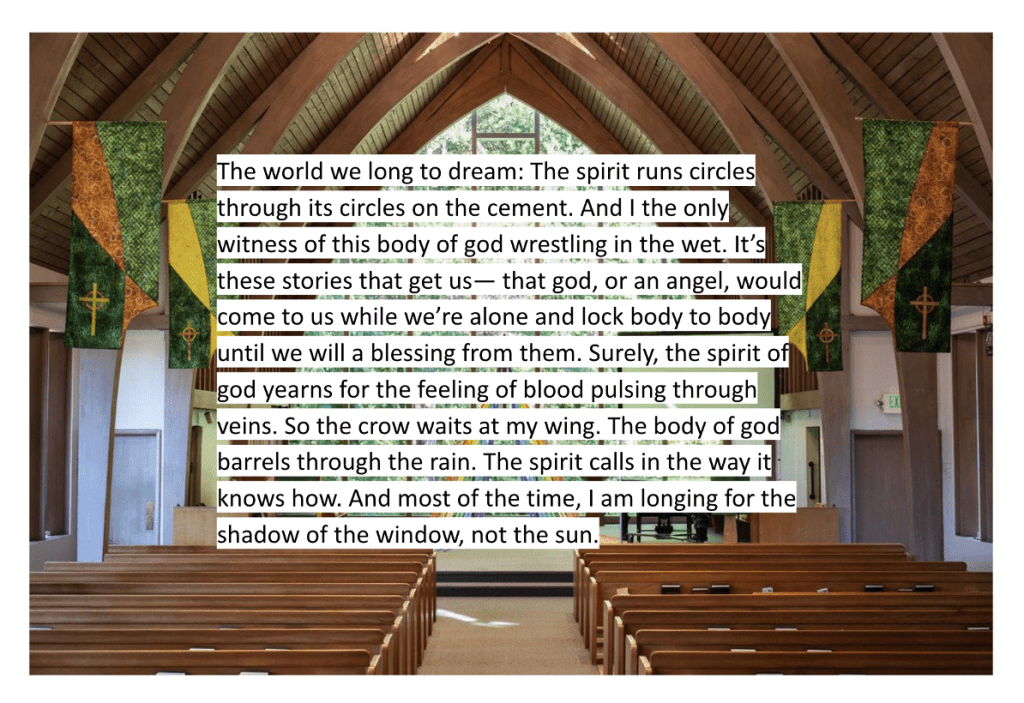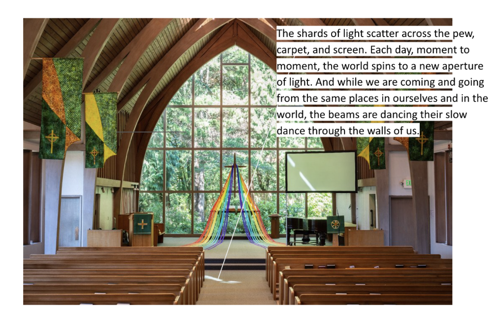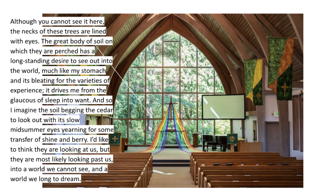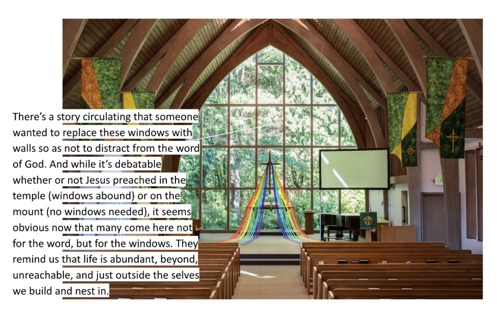 Windows shepherd in light, yes, but the shadows they cast are guides as well. They mean that things are taking shape— that like it or not, the world around us is not projected on a screen of manufactured dimensionality. The world we are in is real, solid, and much of it opaque. The spirit and the body are not distinct, and if we can pay attention, the speechless world is humming and brimming with meanings we can observe, but never fully know. The light comes to shine on my skin as much as the skin of my table, it streams into Fauntleroy Church’s ceiling to floor windows that are facing east, the same direction the earth is spinning. This light is filtered first through tree and hill, softening its landing on the old, massive bible at the back of the apse, and I am in the final pew, where the light is cool and diffused. I look out through the window, asking questions of the trees.