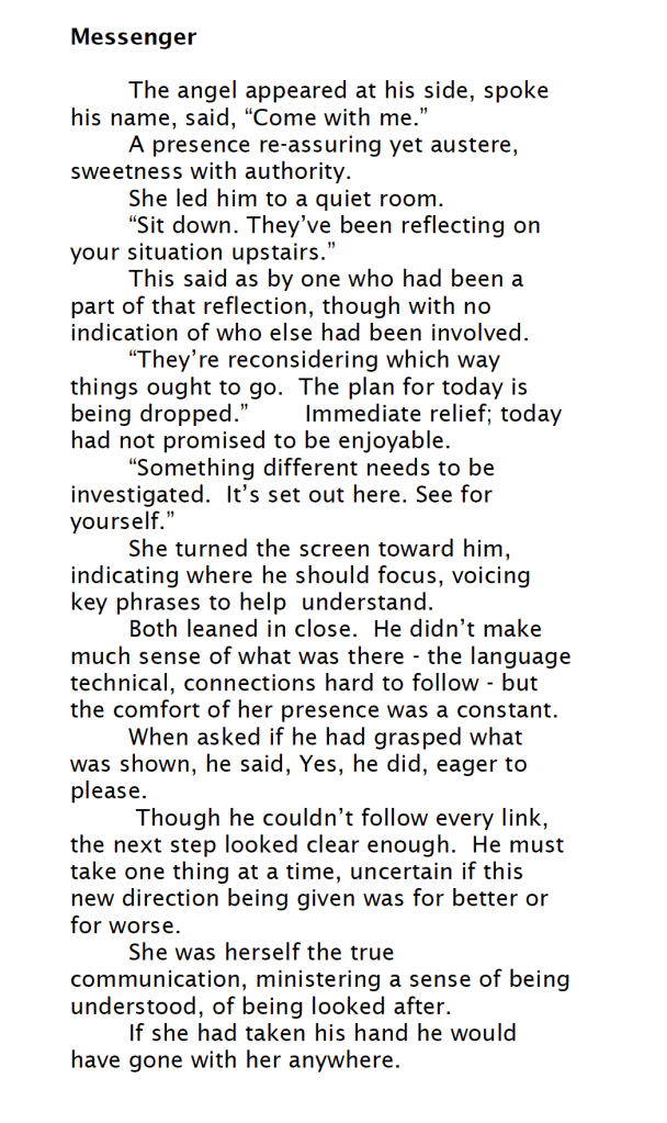 The park rangers come to us before breakfast, in a little boat that bumps against our mammoth one, through fog and frigid waters, the wind roughing their lips and cheeks. They climb aboard on a rope ladder. We are snug in our cabins and do not see. But soon we hear them, stationed around the ship, on its public address, telling us about the bay, the mountains, the glaciers. From our balcony I think I recognize: a lumbering boulder of brown bear on the shore, sea lions sunning shoulder to shoulder like tourists on a crowded beach, a distant humpback whale. When the sun comes out, I cry for the beauty—gray mountains and rocks, a sparkling azure sky, white and aqua ice, otters swimming near the ship, one hitchhiking on a chunk of ice. Later, we gather on the bow to eat pea soup, and even the crew comes out to blink at the brilliance—so rare, they say. I think I am learning: glacial silt, phytoplankton, privilege. But when the ship comes close to the glacier and I hear it rumble and calve, mighty pieces of itself crashing to the water, I finally understand: ancient, holy, separation. Earth, the great maternal beast.