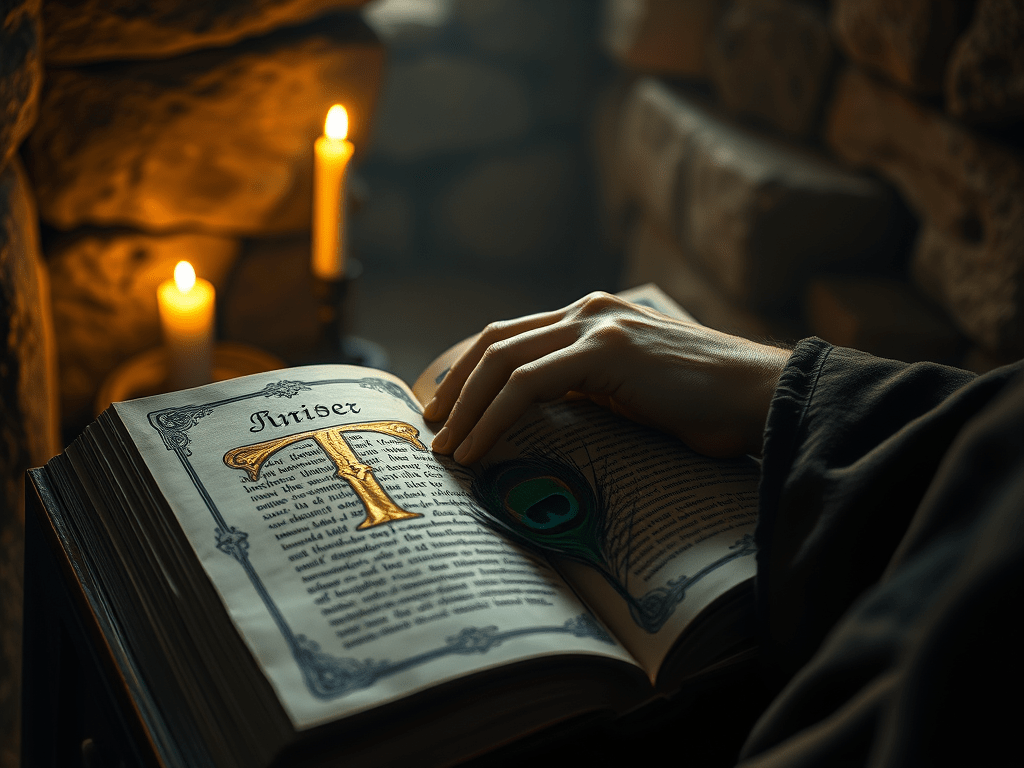 It is late. He should sleep, but tonight the monk feels a restless pull from the manuscript before him. Under the frail, flickering candle, the illuminated capital letter (the T of Tau) shimmers with gold filigree. It is a beacon—but the apostle’s words that follow are dull, mere shadows. Whenever this mood descends, everything becomes leaden—all that is real is the sullen flesh. His hand rests heavy on the vellum: calf skin. His quill is nothing but a bird feather: a dead thing plucked from a dead thing.