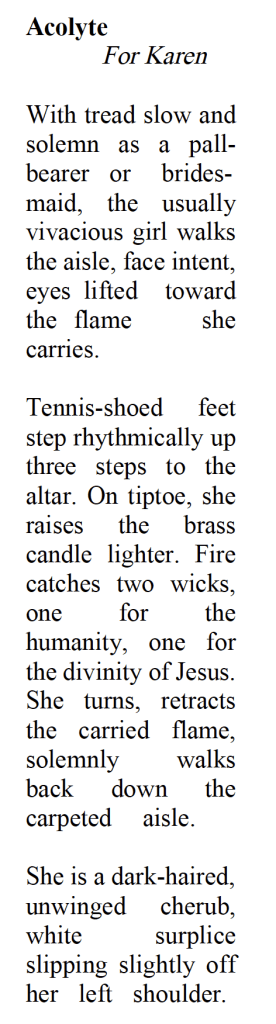 The abbey cat purrs in the corner. Is she enjoying infused meditation? Bright dreams of bloody murder? He remembers her asleep outside in the summer, her head resting in a halo of feathers. What is it like to hunt? To pounce and—