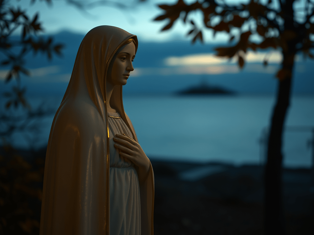 in the churchyard's quiet corner where leaves collect she stands gaze unbroken to the sea somber steady one tear stains her left cheek ~ where are your children Mother what can be done to save them what expanse would you not brook to bring them safely home you know better than we the perils awaiting on the waves ~ what tear falls for me Mother is it the time I've wasted flesh I've feted doors left unopened have I been grateful for the sea and all it contains ~ from your vantage among the stars your silent witness unwavering can you see the speck of me the canopy of night like a magician's robe reveals and conceals in endless folds ~ long have I struggled as one who rows blind in the night like John of the Cross your shimmer on the water lights my way not to the distant shore but to the crest of the next wave ~ nothing left but trust a choice when there is no choice I fold my hands ~ beneath your light o bright and morning star conspicuous in your dark cape of wind I feel the first cold filaments of my leaving