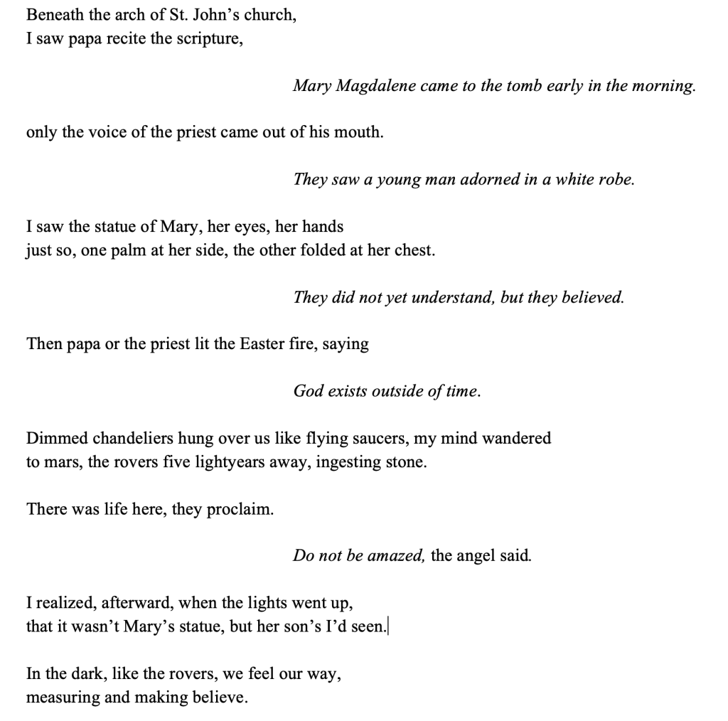 Dev’s hand had healed, and his face where the glass had shattered against him, though his cheeks wore the thin scars like scratches in a fish’s scales, and the hand that offered her the drink she cradled to her belly now beside the pool was knobbed and crooked with its healed-over brokenness and she thought again how like a saint he was with light breaking through the crazes and cracks of his suffering and she was unmoved by the thought, whether to envy or fervor, but she was grateful for him and glad, for his sake, for his goodness, and something whispered this was love.